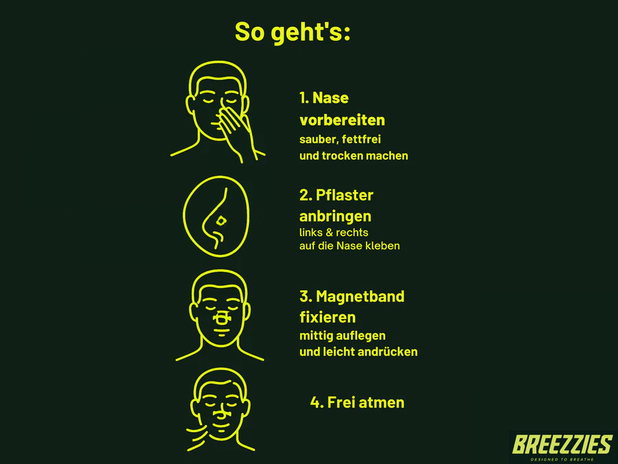Die BREEZZIES magnetischen Nasenstrips heben sanft deine Nasenflügel an. So entsteht ein angenehmes Gefühl an der Nase – für einen frischen Start in den Tag.